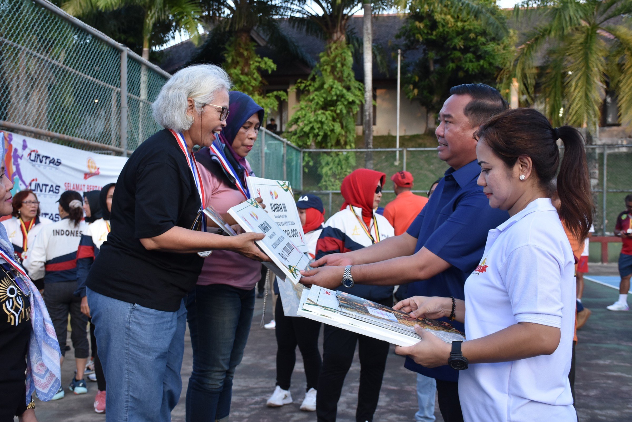 Selanjutnya, Ekti Imanuel diberikan kehormatan untuk mengalungkan medali serta memberikan hadiah uang tunai secara simbolis kepada para juara dari kelas ganda putri usia 40 tahun keatas.